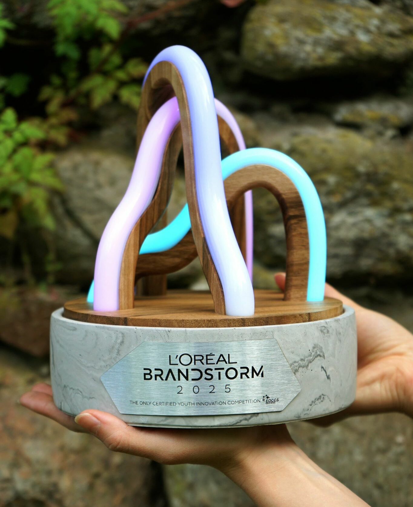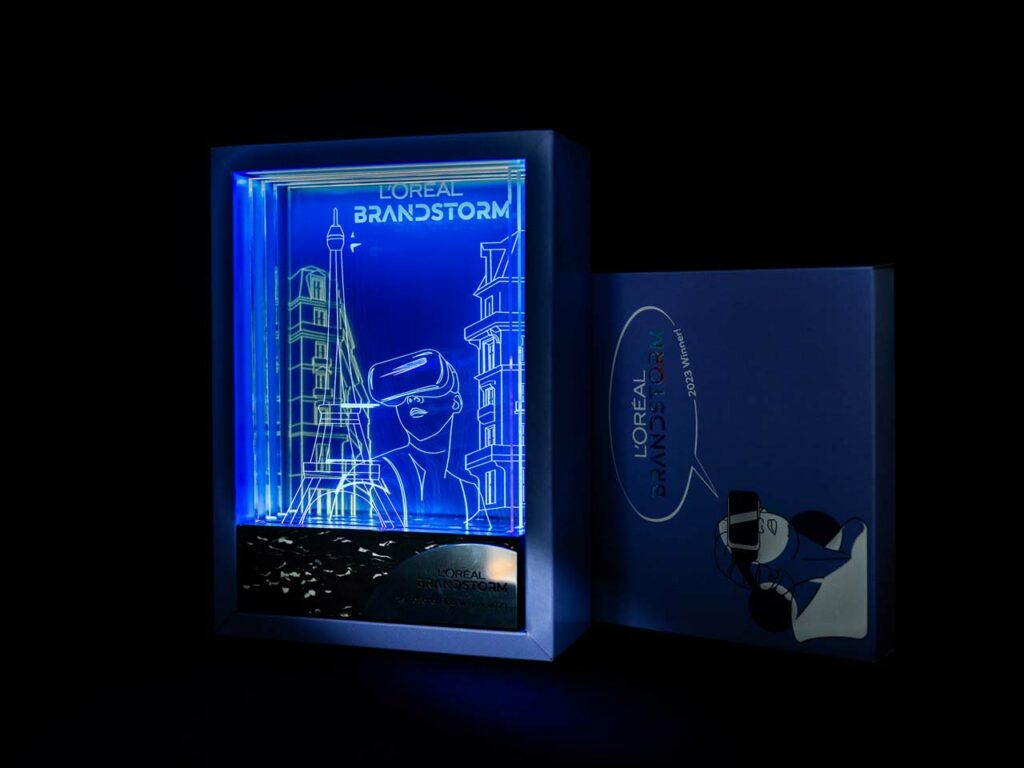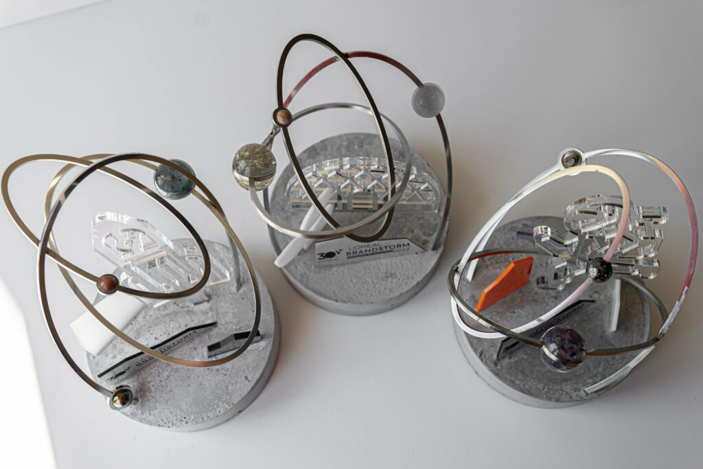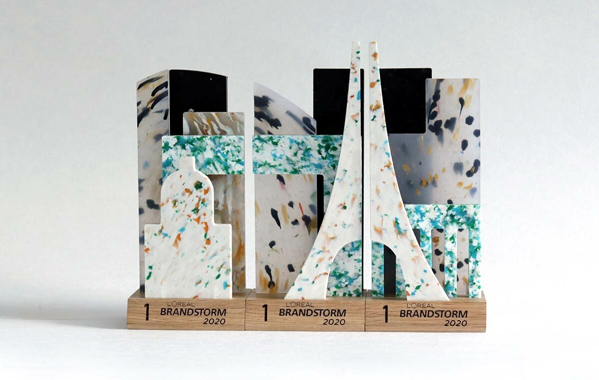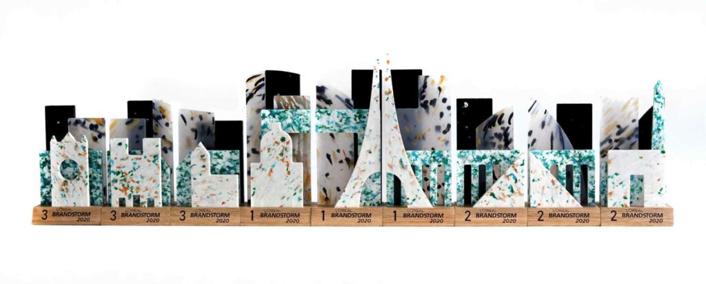 The trophies for the international finals of LOréal Brandstorm 2020 competition, Big City Life combines modern design with traditional handicrafts. The panorama of Paris, which is made up of statuettes, is composed of unique trophies, which are artistic forms made from wood and recycled production waste plastic.